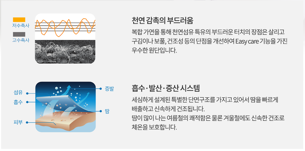 100% 기능성 하이엔드 원단으로 천연섬유의 감성을 느낄 수 있는 부드러운 면의 장점은 살리면서 구김이나 보풀, 건조성 등의 단점을 개선한 고퀄리티 기능성 원단입니다.
